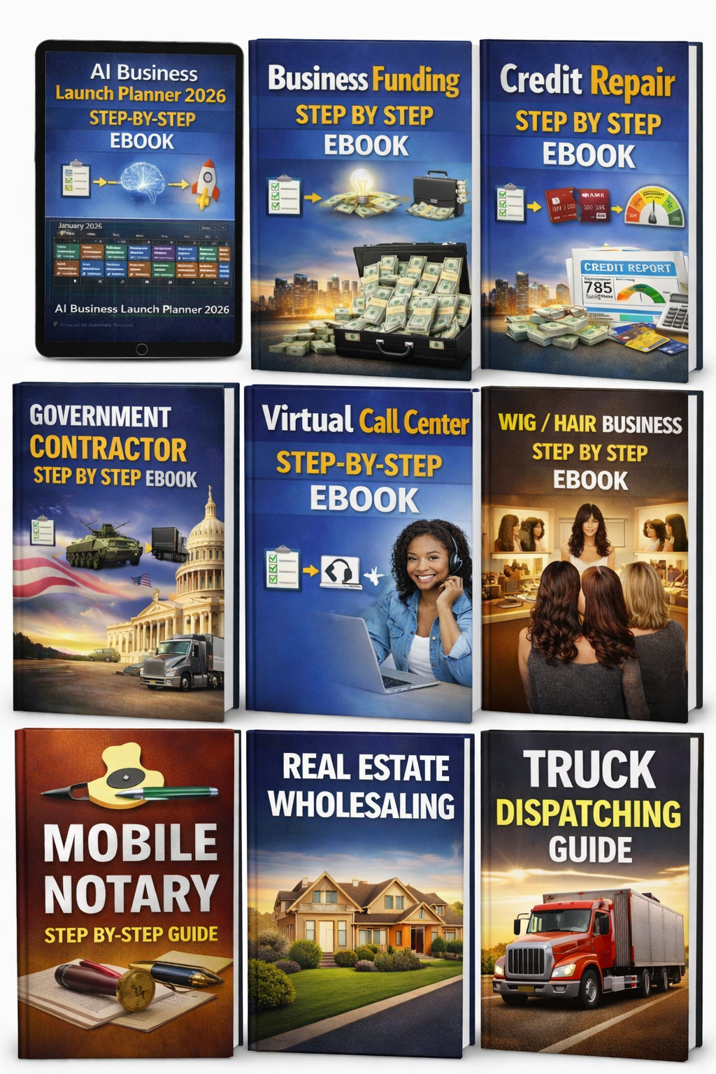 Why settle for one income when you can build multiple? Get instant access to our all-in-one business bundle—AI automation, mobile notary, business funding, wigs & hair, real estate wholesaling, truck dispatching, credit repair, and virtual call centers! Start today.
